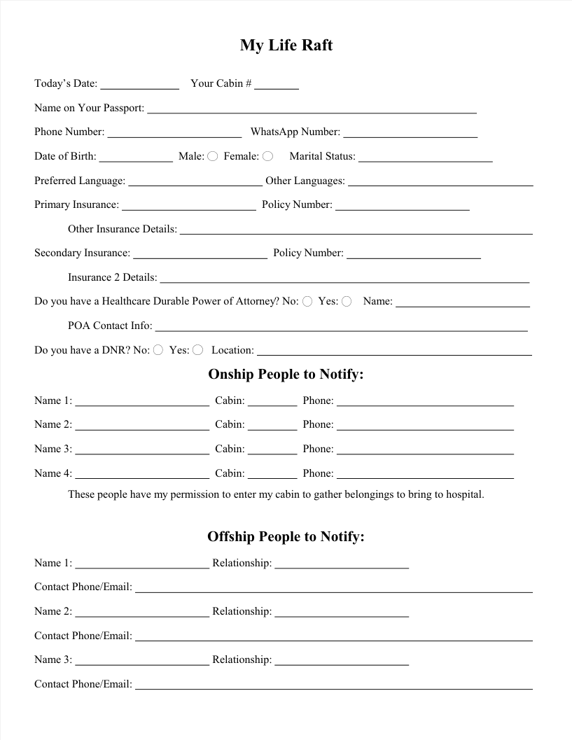 I called it “Your Life Raft”. It doesn’t replace insurance, research, or your own history knowledge. It aids you having everything gathered together that a hospital might need to get going on treating you. Part of the Life Raft is to have Buddies identified who will assist you in any number of ways. I hope I never need my Life Raft Buddies, but I have my form and Buddies all ready to go should that need arise.