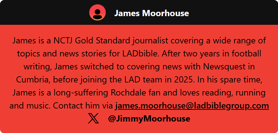 A profile card for James Moorhouse, a journalist at LADbible. The card lists his experience, interests, and contact details, with a red and black design and icons for email and Twitter.