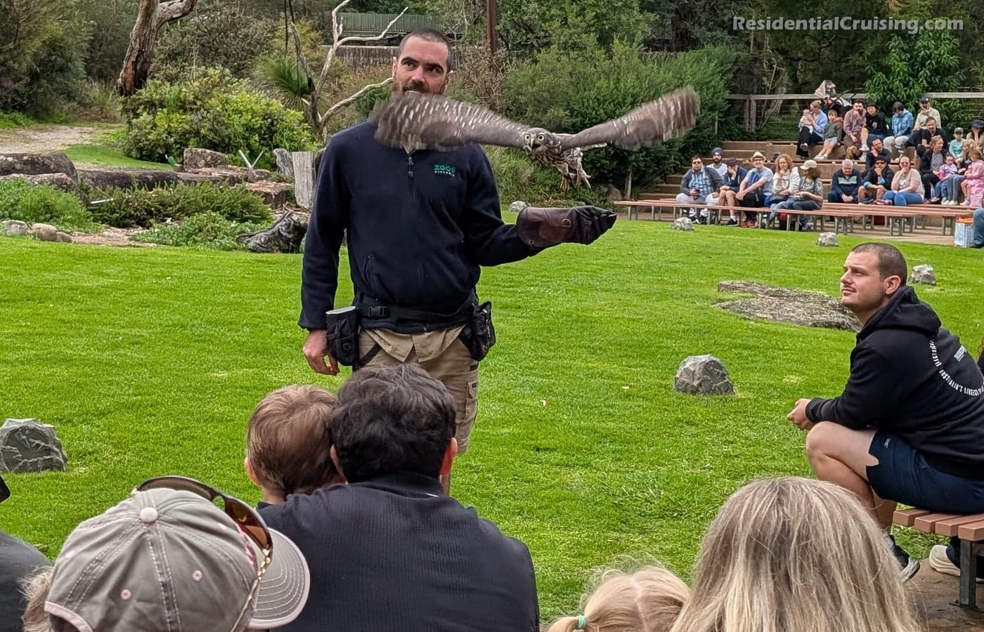Their suggestion was perfect: I saw my first live kangaroos, koalas, wombats, Tasmanian devils, and more. One of our favorite parts was an open air arena where we were introduced to quite a few of their rehabilitated birds, including a gorgeous Australian boobook owl that flew by my head, just inches away, and I felt the whoosh of air from its wings even though I was wearing a hat.